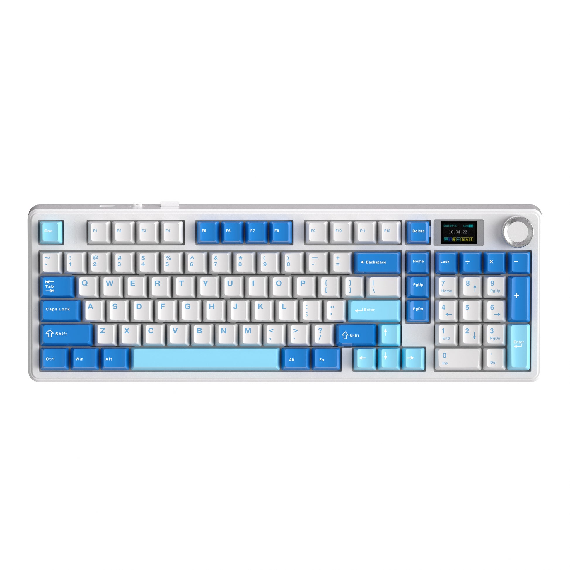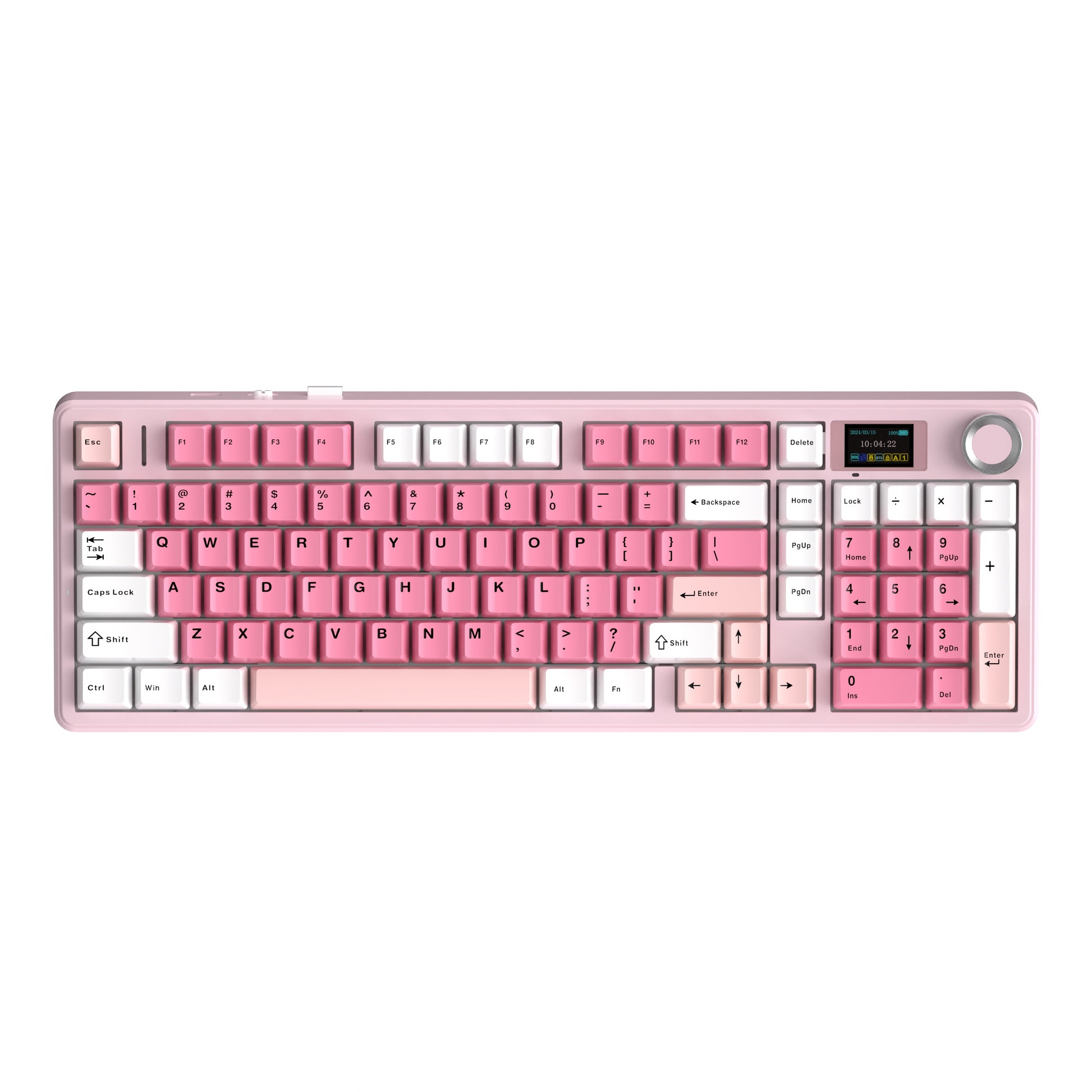 For a practical, stylish and durable typing experience, the F99 MAX keyboard features the 97-key numpad-included layout, vibrant blue/pink PBT keycaps and thick ABS plastic case. The center of this custom keyboard is the TFT smart screen and rotary knob, for you to express your creativity with custom gif image, check vitals such as time or battery level, and intuitive control for volume or RGB backlight.